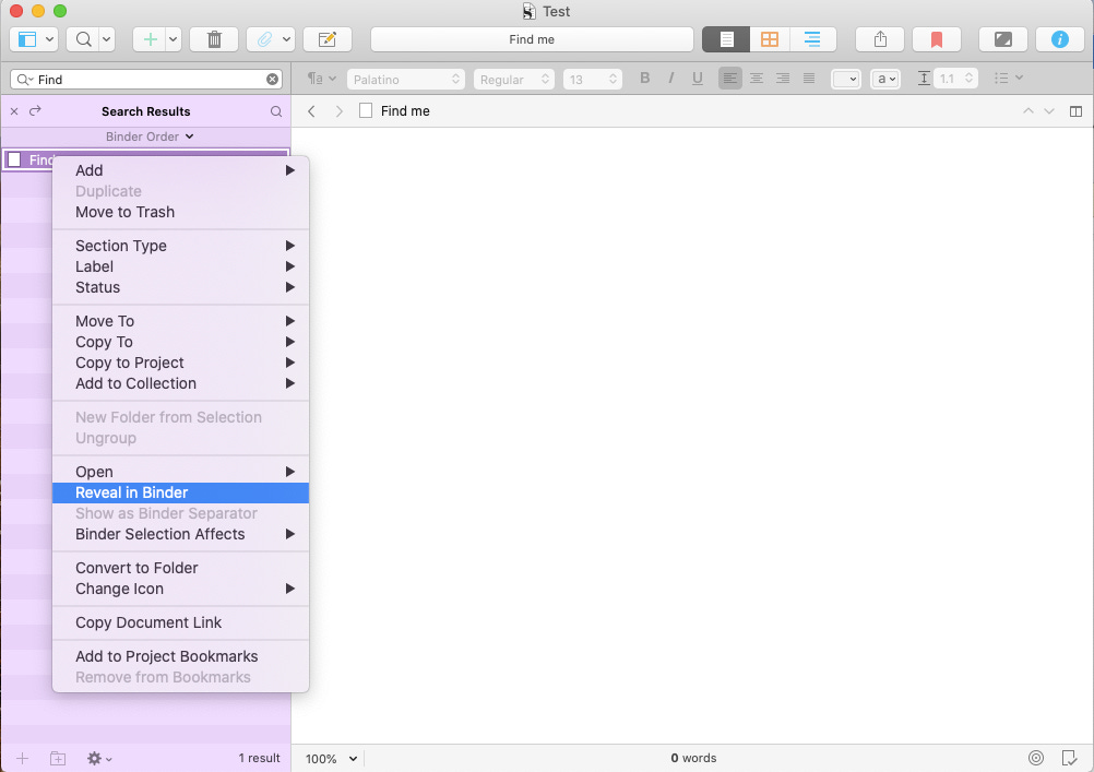 Say that using the search options above, you finally manage to locate a particular document in the results list but don’t know where in your binder it lives. Simply right-click the file name and select “reveal in binder” and voila — you (ahem, I) can finally figure out where you stuck the dang thing. (Thanks to the Scrivener experts in Science Binders for that tip!)