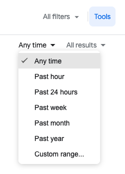 Note: you can also narrow results by date on the regular Google search page by going to the Tools button in the upper right and selecting a date range (see below). You can also apply all of these filters and more in Google’s advanced search.